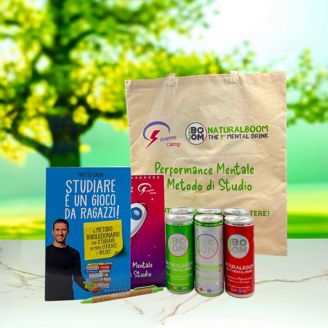 Studiare è un gioco da ragazzi di Matteo Salvo + 6 lattine di NaturalBoom, Shopper, Penna e Block Notes